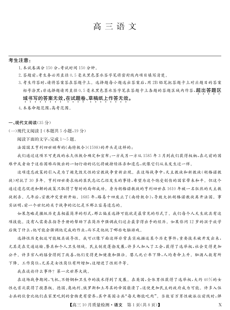 湖北省九师联盟2024届高三10月质量检测 语文