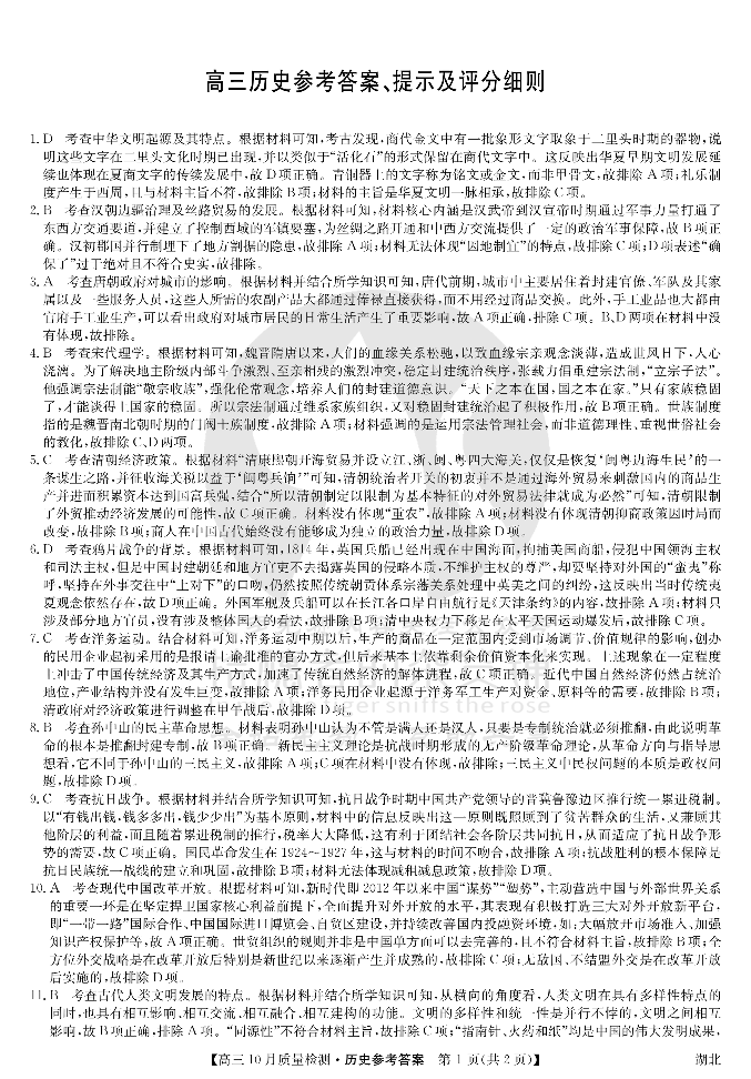 湖北省九师联盟2024届高三10月质量检测 历史答案