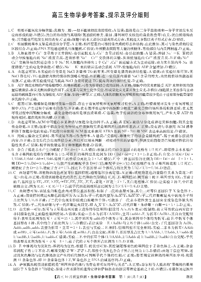 湖北省九师联盟2024届高三10月质量检测 生物答案