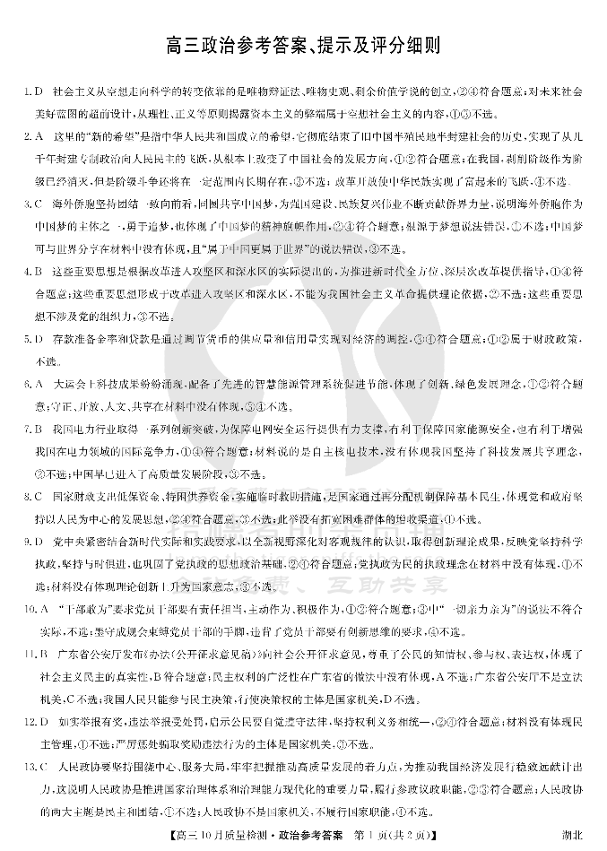 湖北省九师联盟2024届高三10月质量检测 政治答案