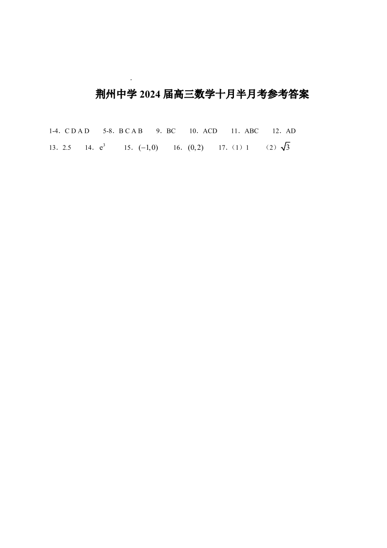 湖北省荆州中学2023-2024学年高三上学期10月半月考 数学答案