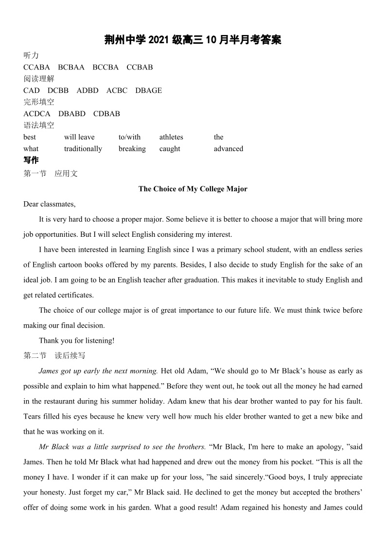 湖北省荆州中学2023-2024学年高三上学期10月半月考 英语答案