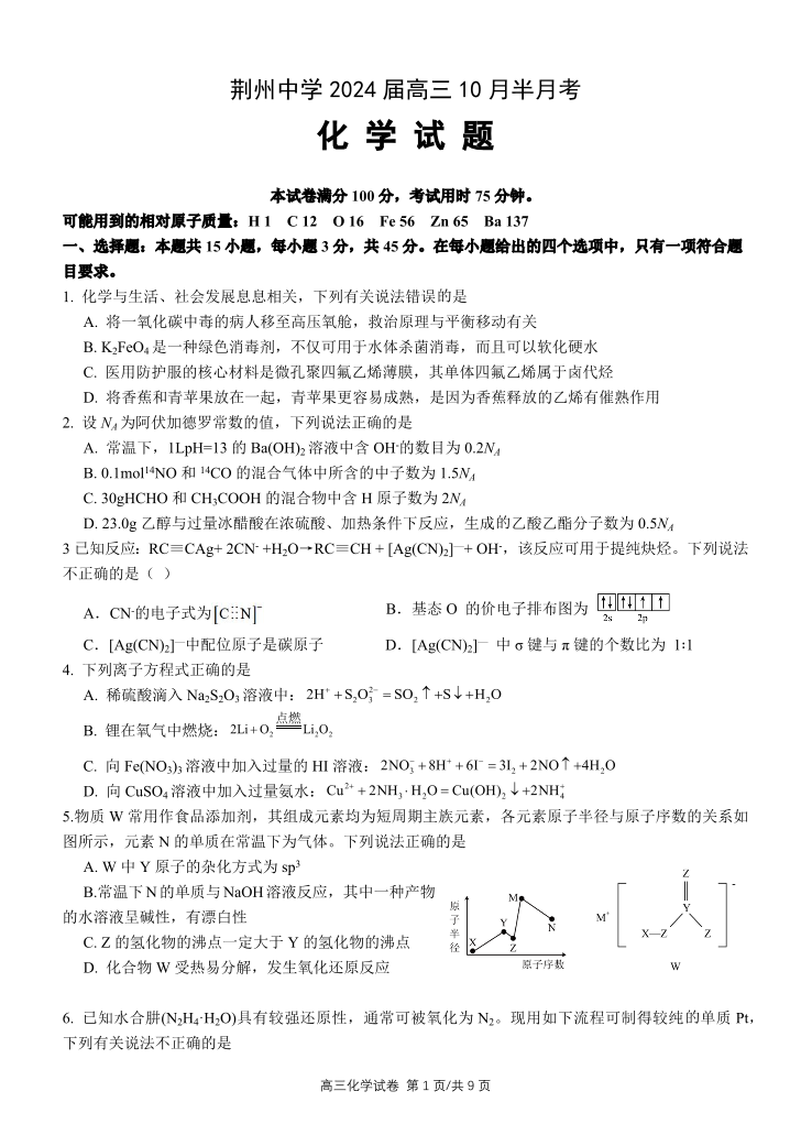 湖北省荆州中学2023-2024学年高三上学期10月半月考 化学