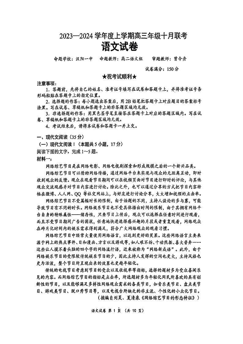 腾云联盟2023-2024学年度上学期高三年级十月联考 语文