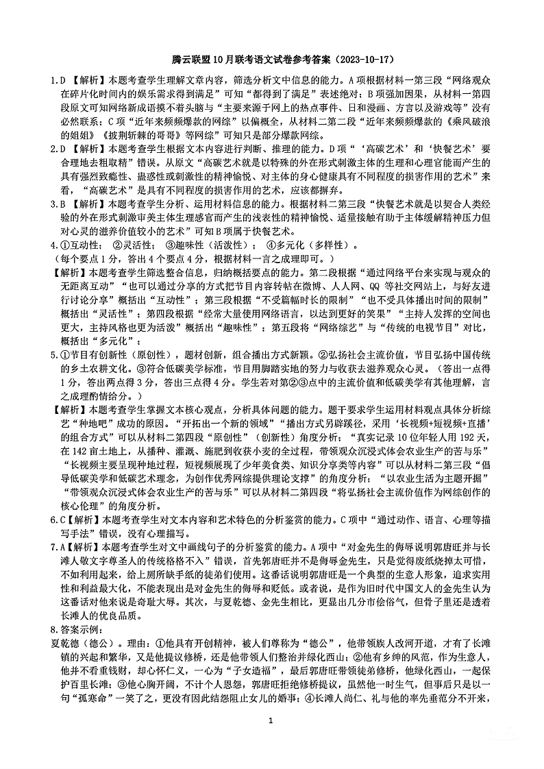腾云联盟2023-2024学年度上学期高三年级十月联考 语文答案