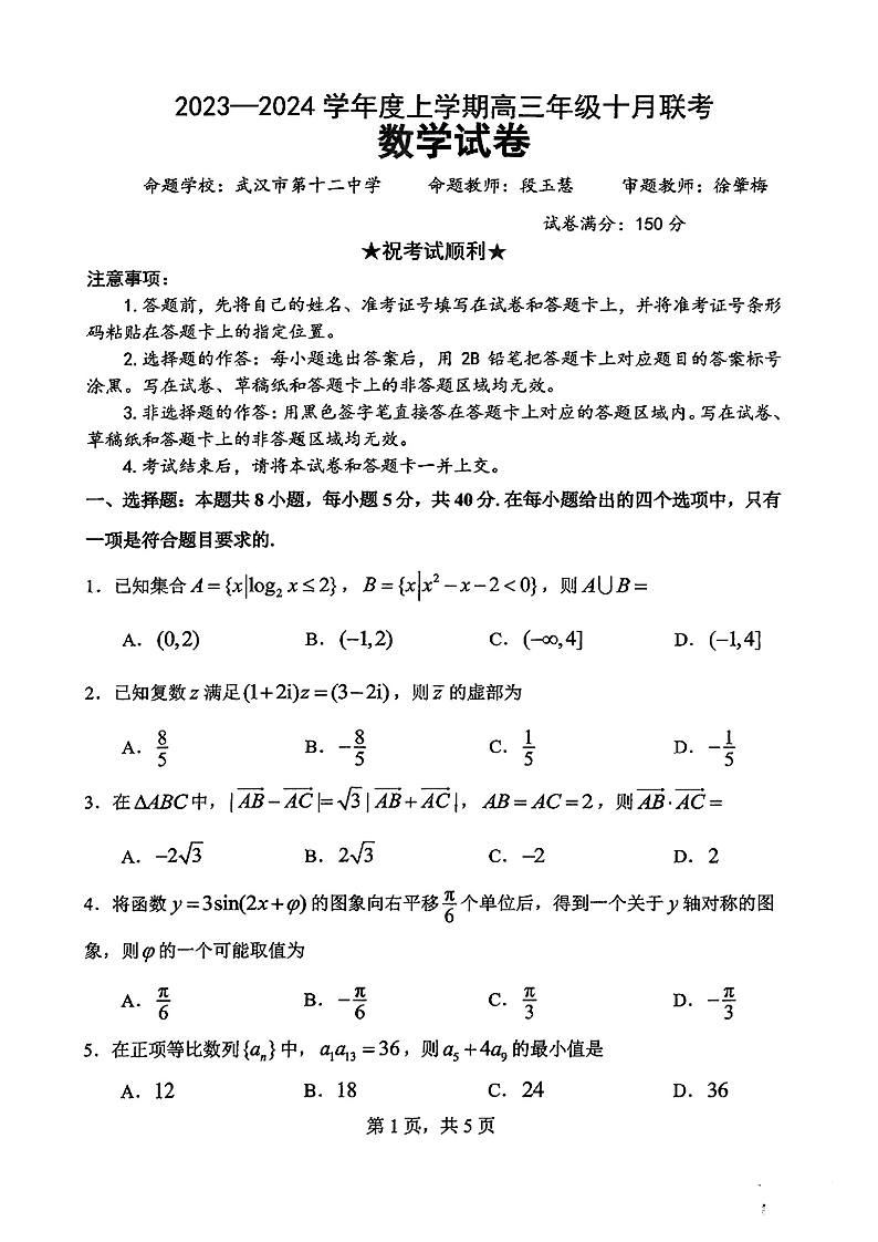 腾云联盟2023-2024学年度上学期高三年级十月联考 数学
