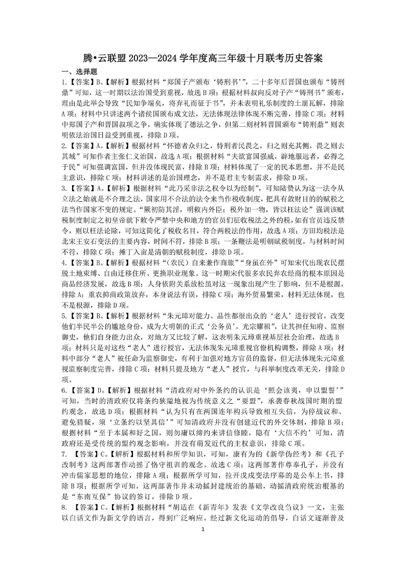 腾云联盟2023-2024学年度上学期高三年级十月联考 历史答案