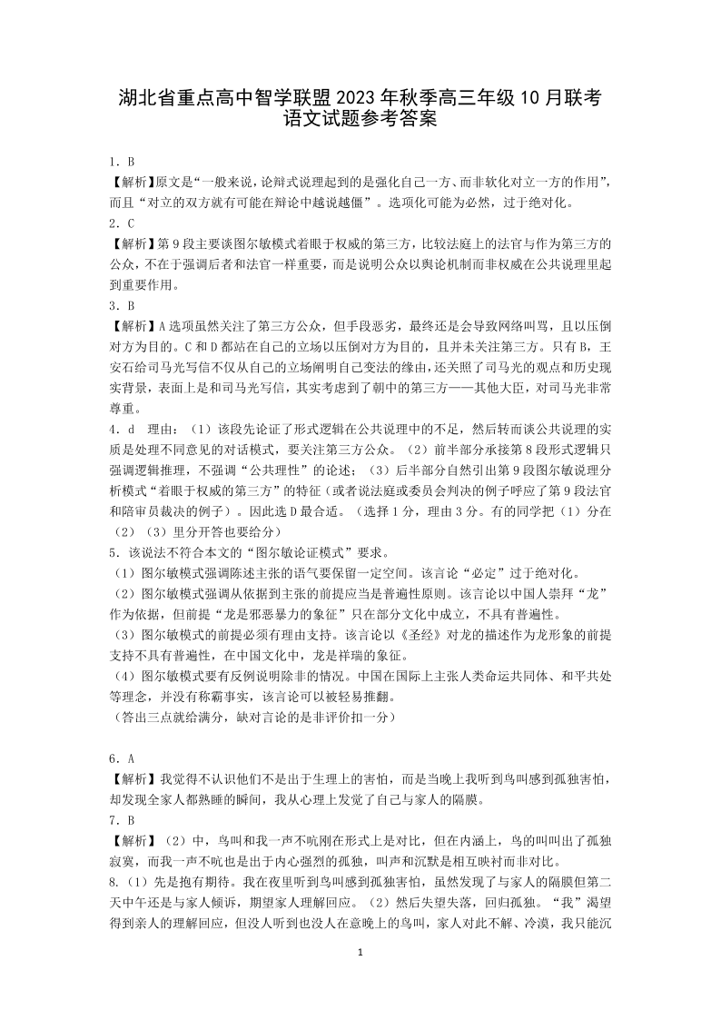 湖北省重点高中智学联盟2023-2024学年高三上学期10月联考 语文答案