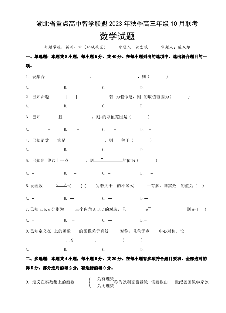 湖北省重点高中智学联盟2023-2024学年高三上学期10月联考 数学