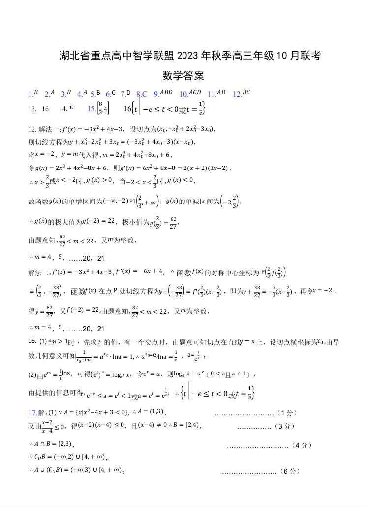 湖北省重点高中智学联盟2023-2024学年高三上学期10月联考 数学答案