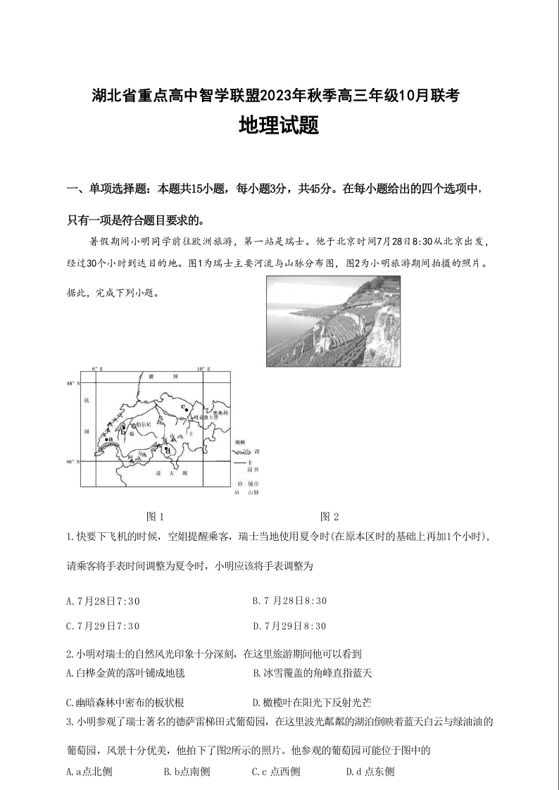 湖北省重点高中智学联盟2023-2024学年高三上学期10月联考 地理