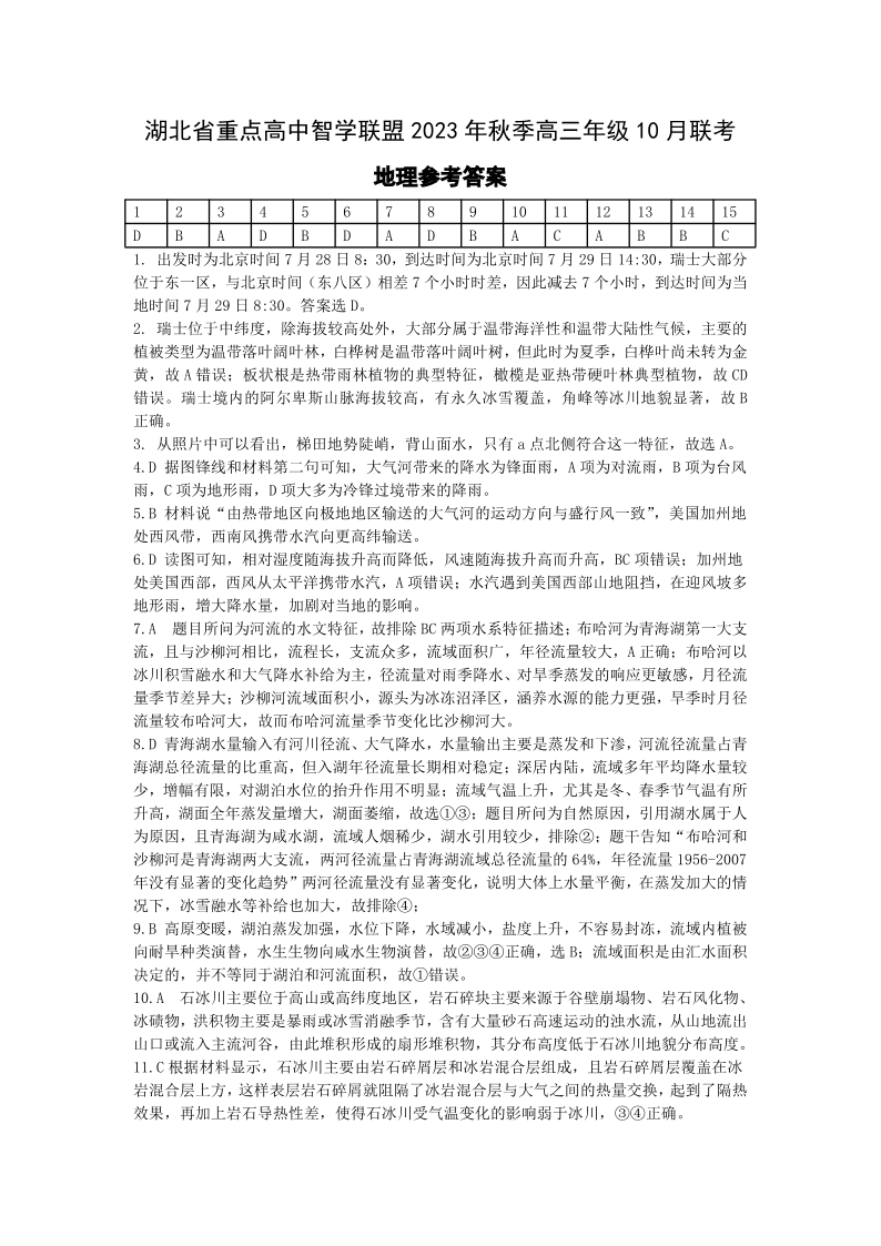 湖北省重点高中智学联盟2023-2024学年高三上学期10月联考 地理答案
