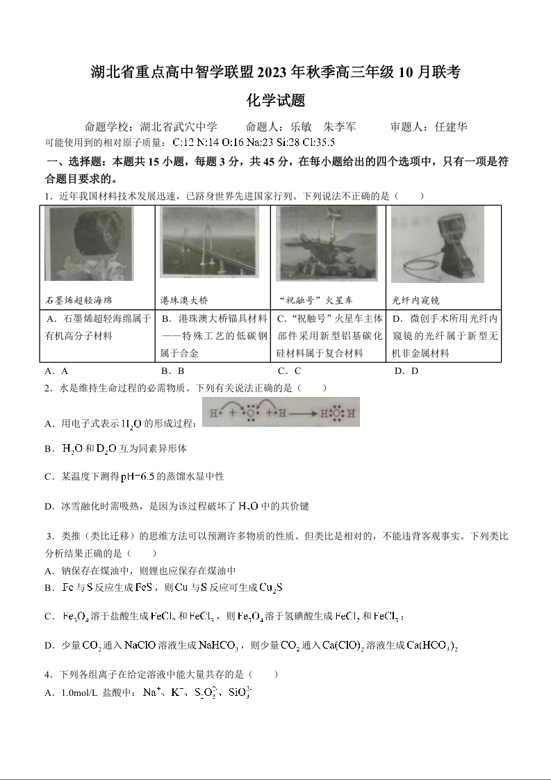 湖北省重点高中智学联盟2023-2024学年高三上学期10月联考 化学