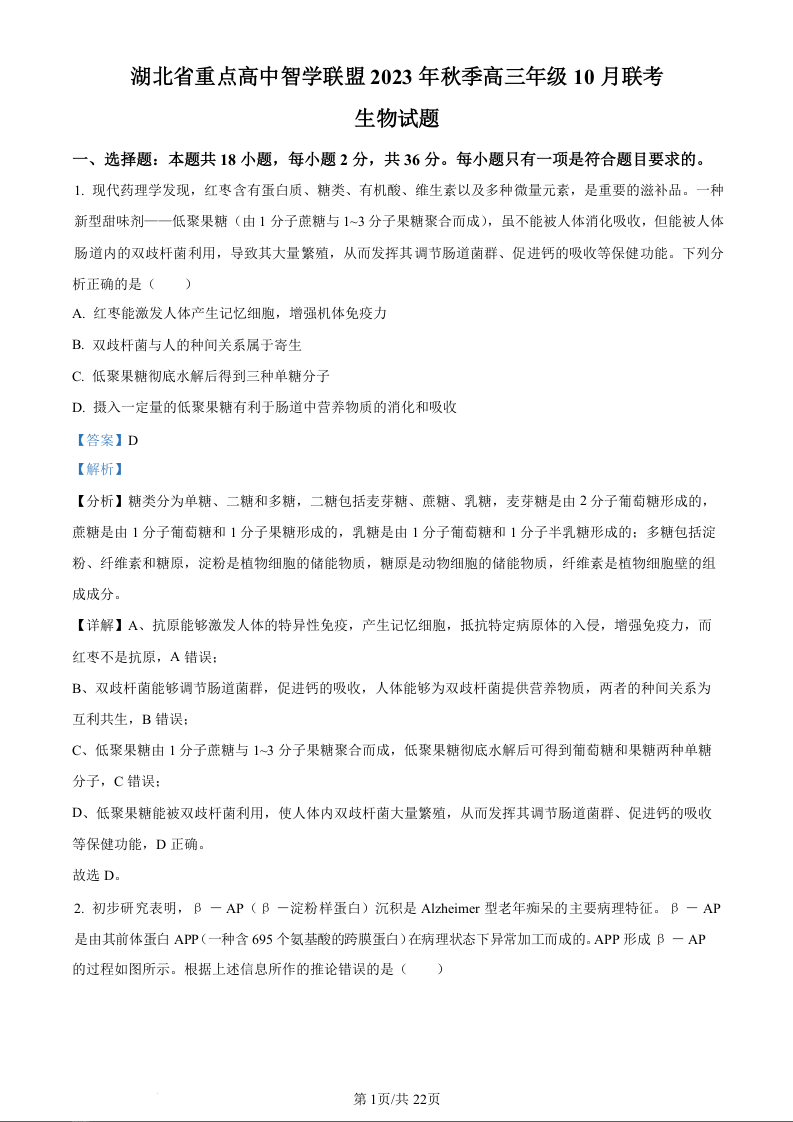 湖北省重点高中智学联盟2023-2024学年高三上学期10月联考 生物答案