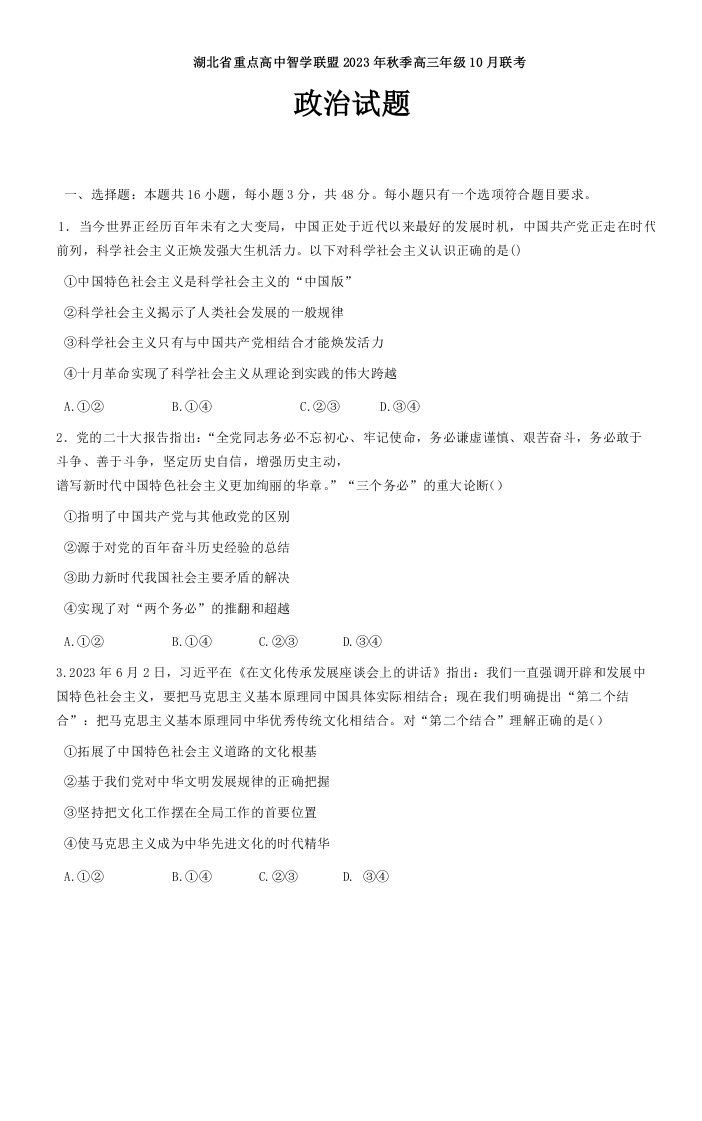 湖北省重点高中智学联盟2023-2024学年高三上学期10月联考 政治