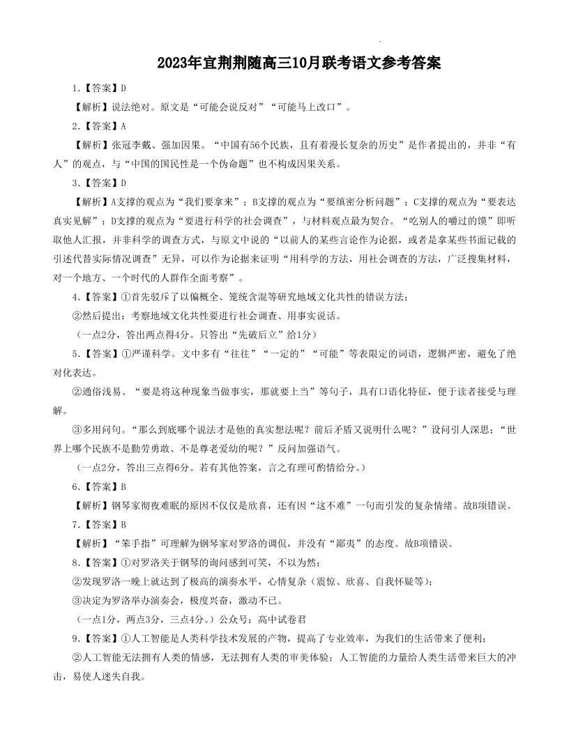 湖北省宜荆荆随2023-2024学年高三上学期10月联考 语文答案