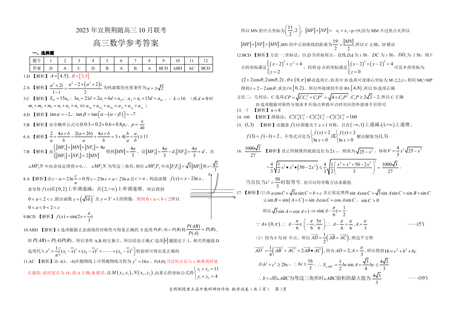 湖北省宜荆荆随2023-2024学年高三上学期10月联考 数学答案