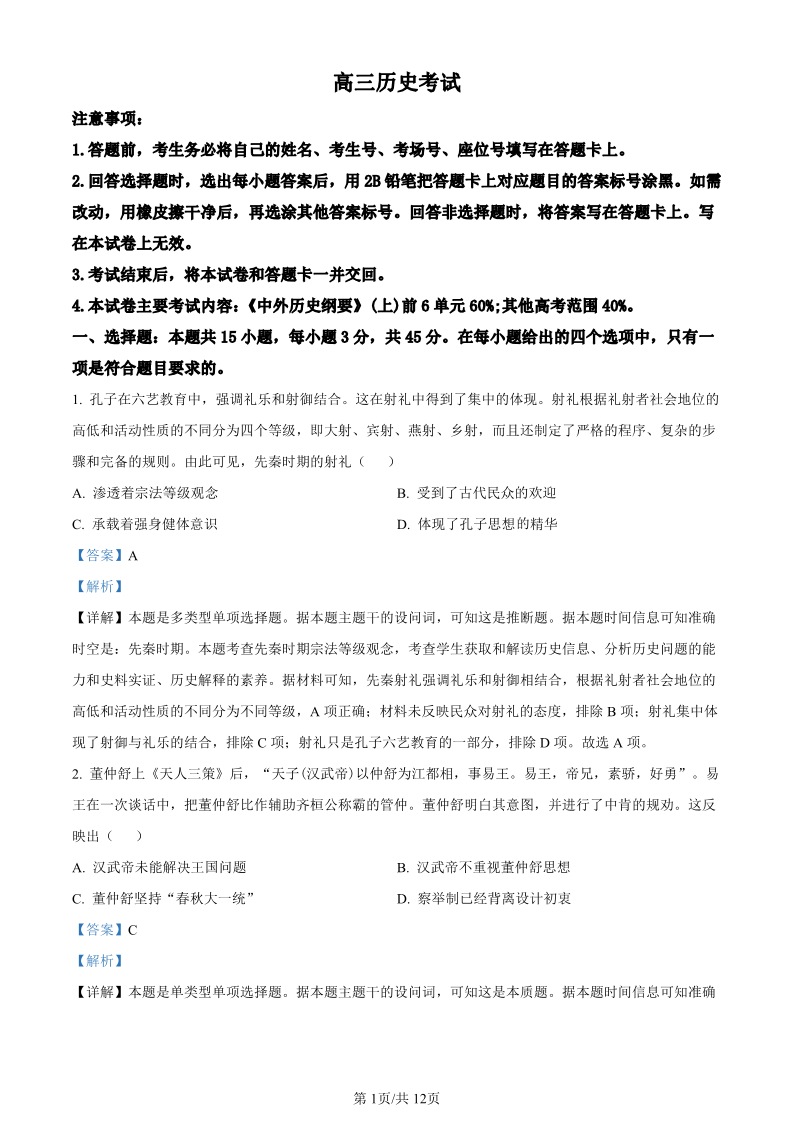 湖北省部分学校2023-2024学年高三上学期10月月考 历史答案