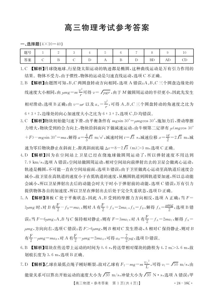 湖北省部分学校2023-2024学年高三上学期10月月考 物理答案