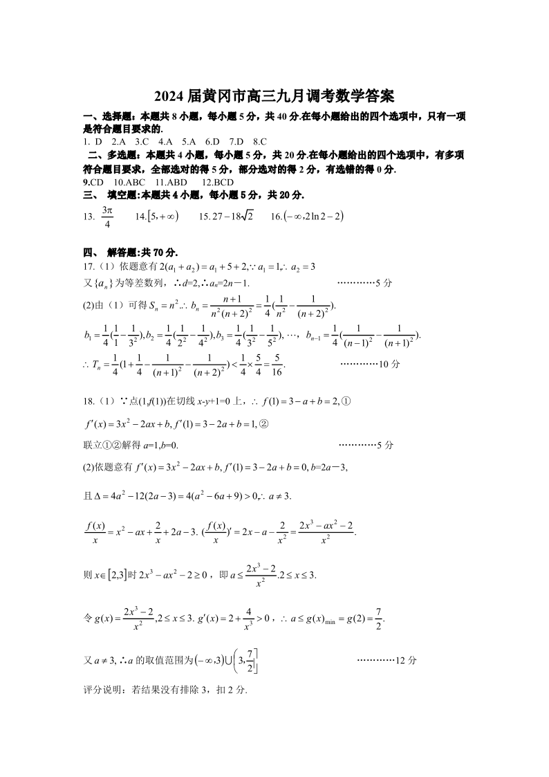 黄冈市2023年高三年级9月调研考试 数学参考答案