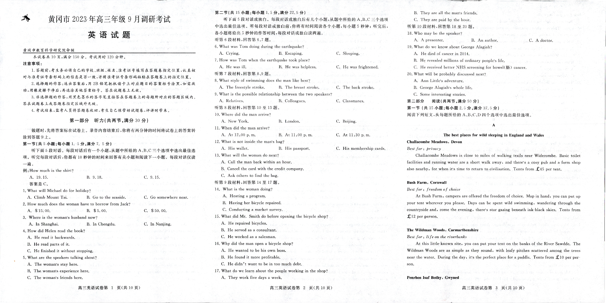 黄冈市2023年高三年级9月调研考试 英语