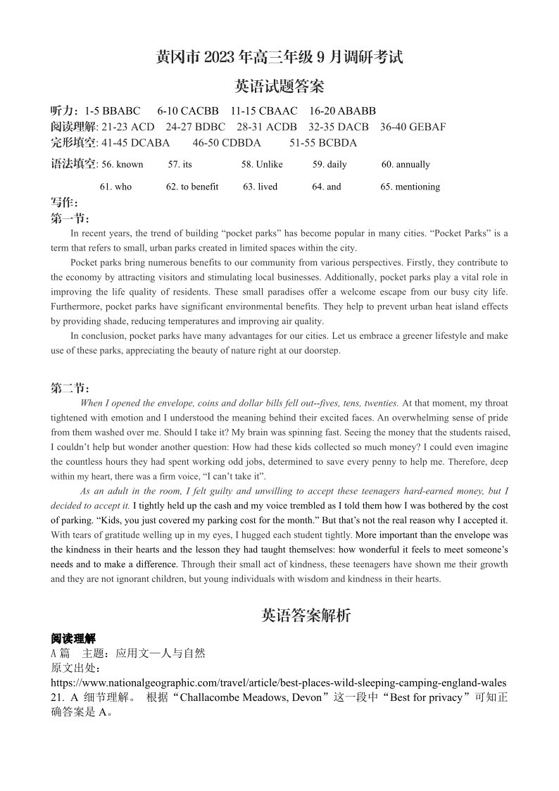 黄冈市2023年高三年级9月调研考试 英语参考答案