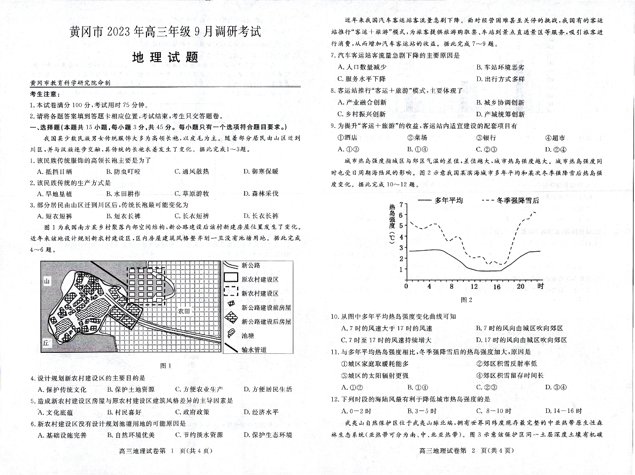 黄冈市2023年高三年级9月调研考试 地理