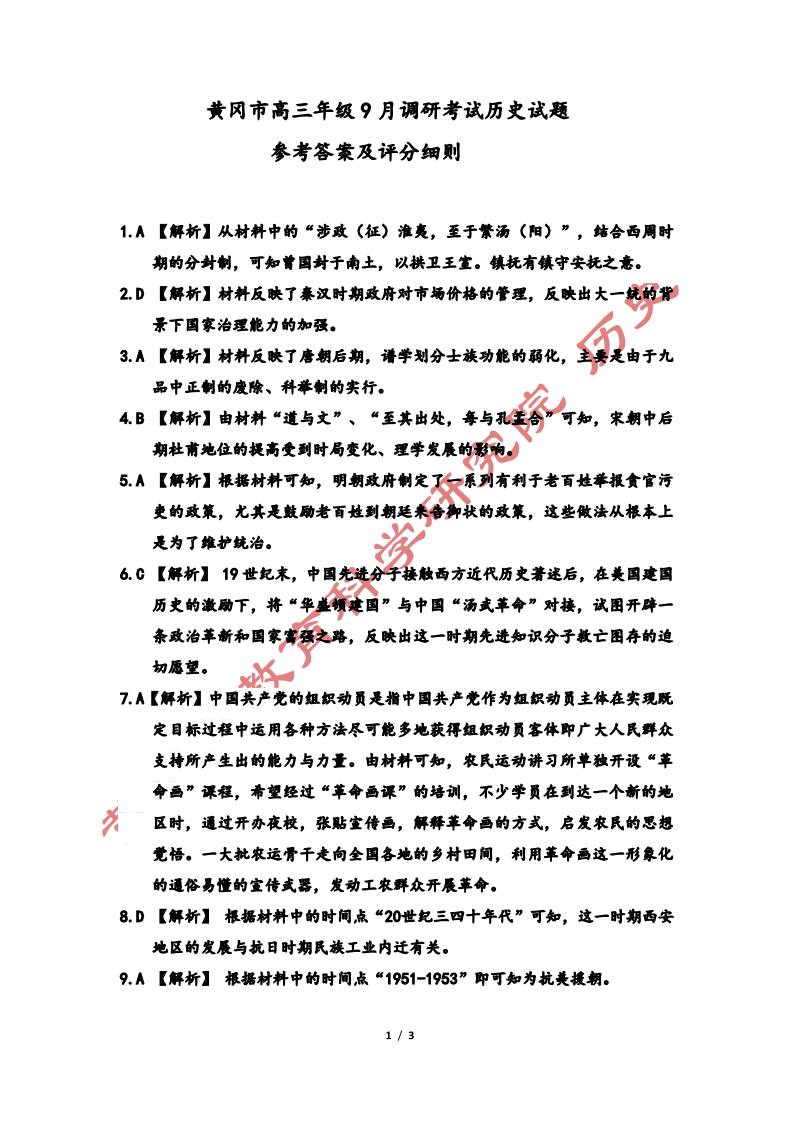 黄冈市2023年高三年级9月调研考试 历史参考答案