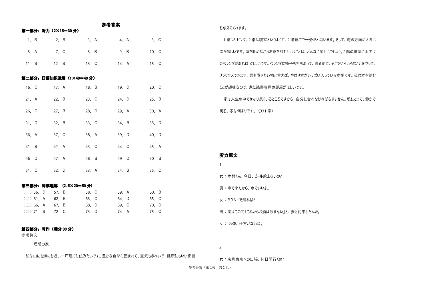 黄冈市2023年高三年级9月调研考试 日语参考答案