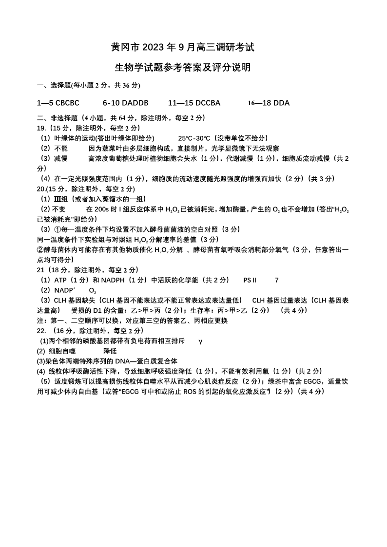 黄冈市2023年高三年级9月调研考试 生物参考答案
