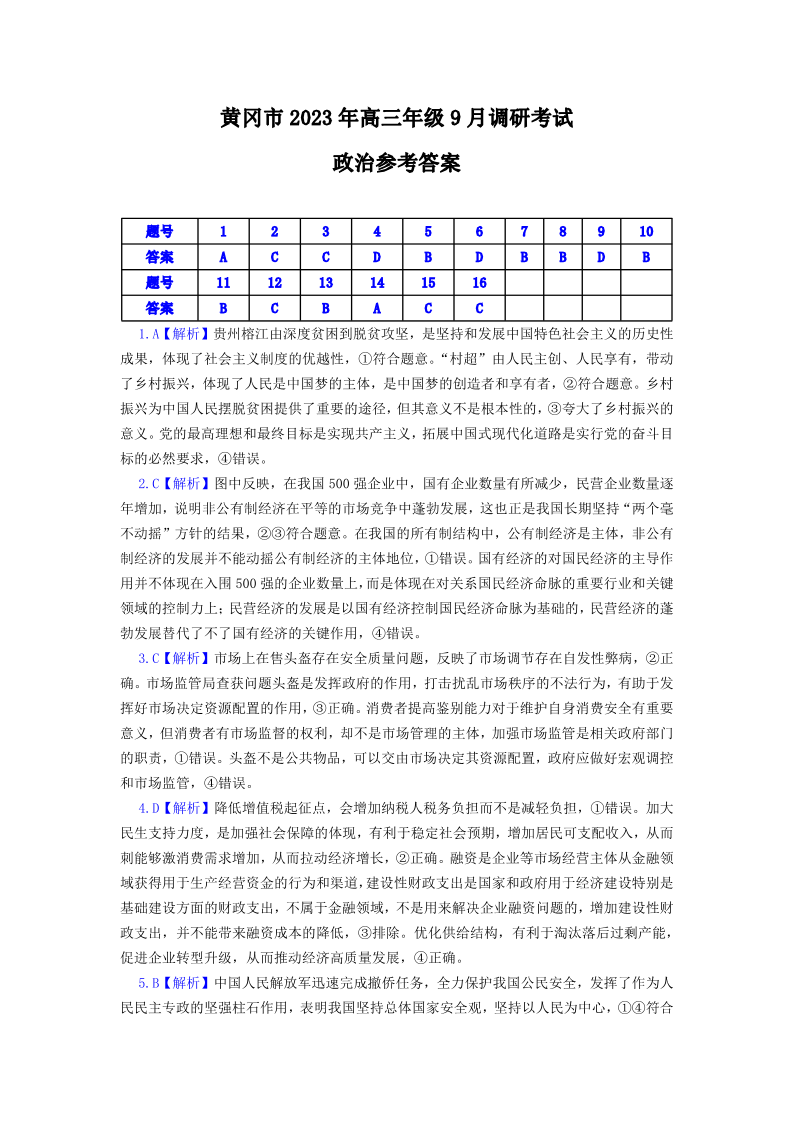 黄冈市2023年高三年级9月调研考试 政治参考答案