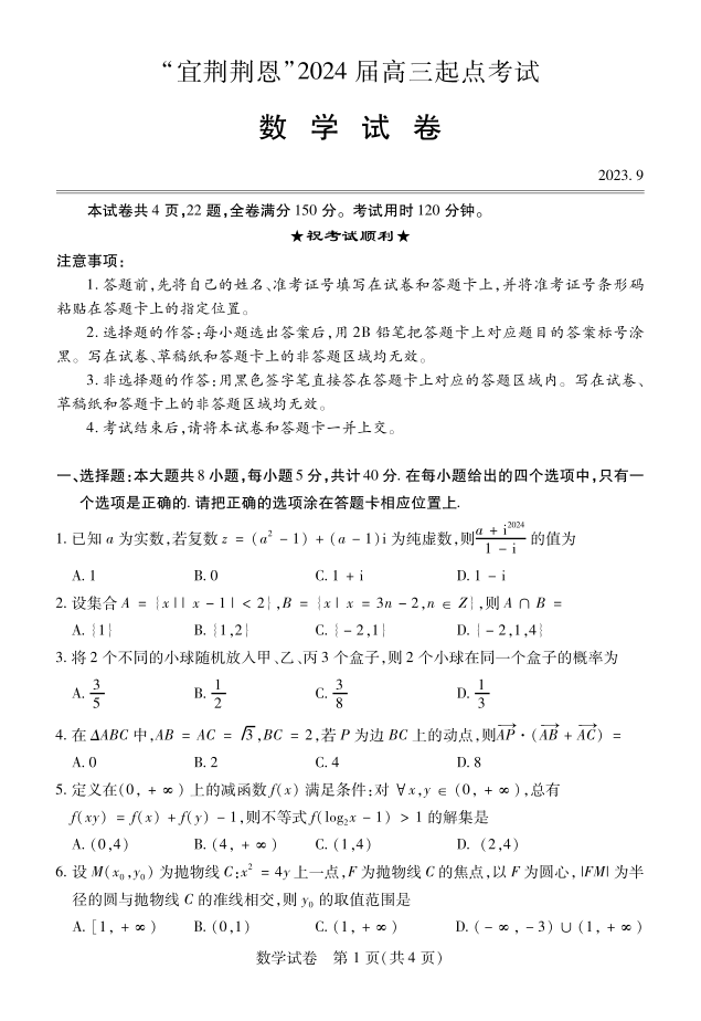 湖北省宜荆荆恩2023-2024学年高三上学期9月起点考试 数学