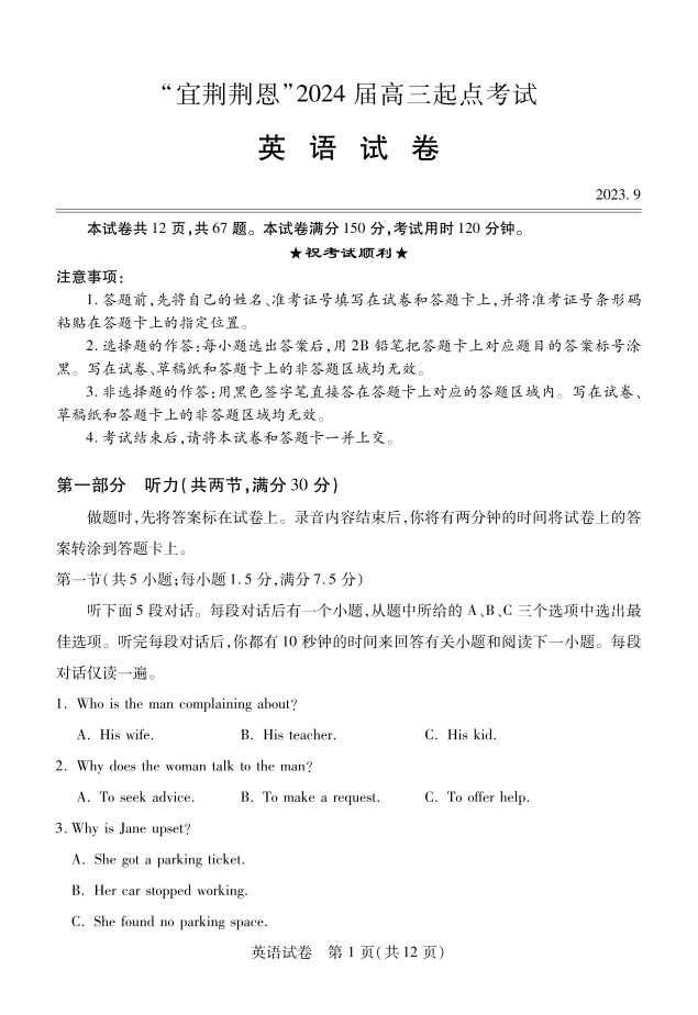 湖北省宜荆荆恩2023-2024学年高三上学期9月起点考试 英语