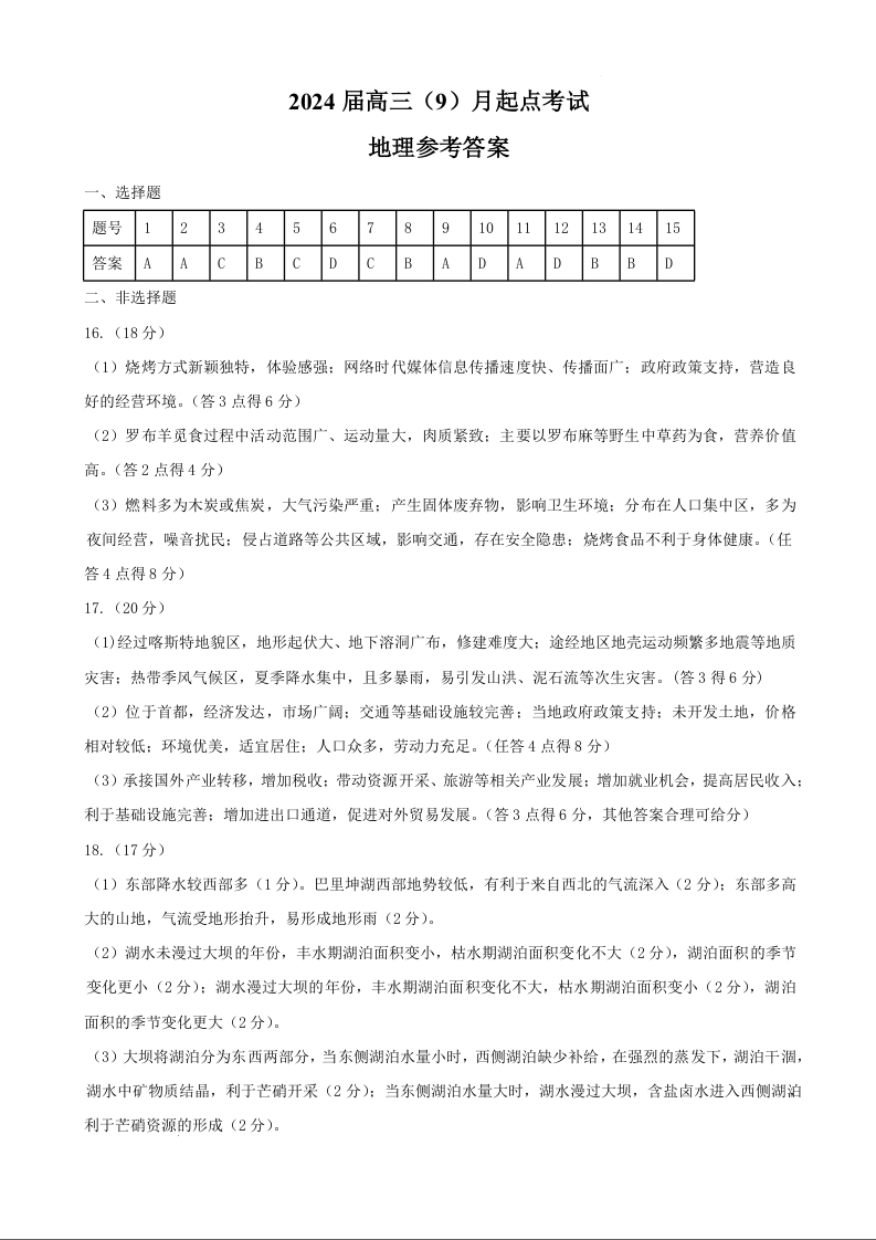 湖北省宜荆荆恩2023-2024学年高三上学期9月起点考试 地理答案