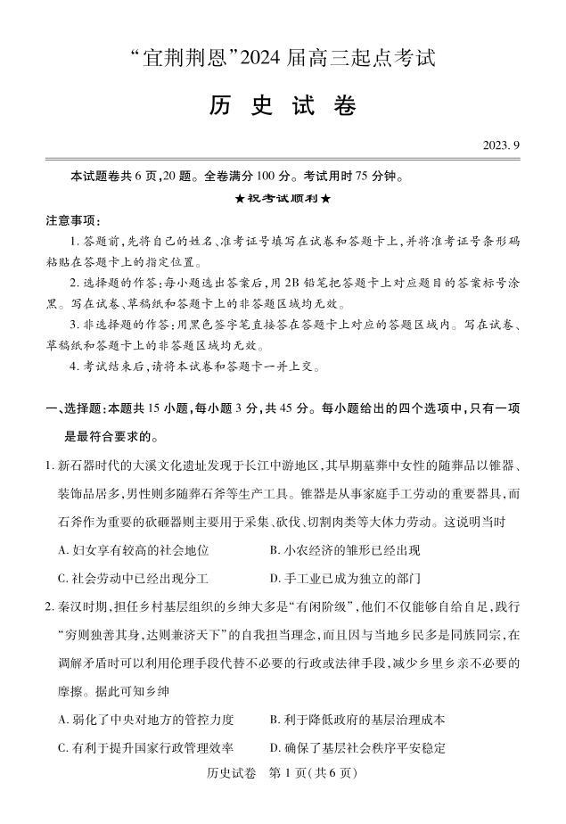 湖北省宜荆荆恩2023-2024学年高三上学期9月起点考试 历史