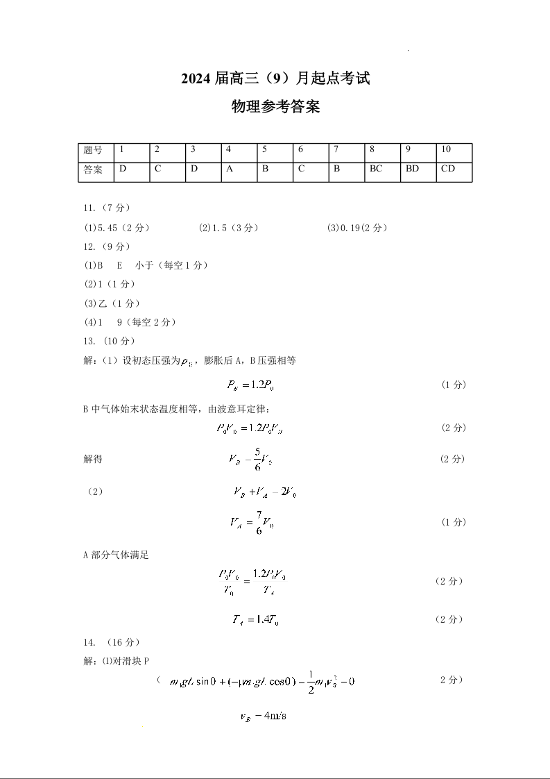 湖北省宜荆荆恩2023-2024学年高三上学期9月起点考试 物理答案