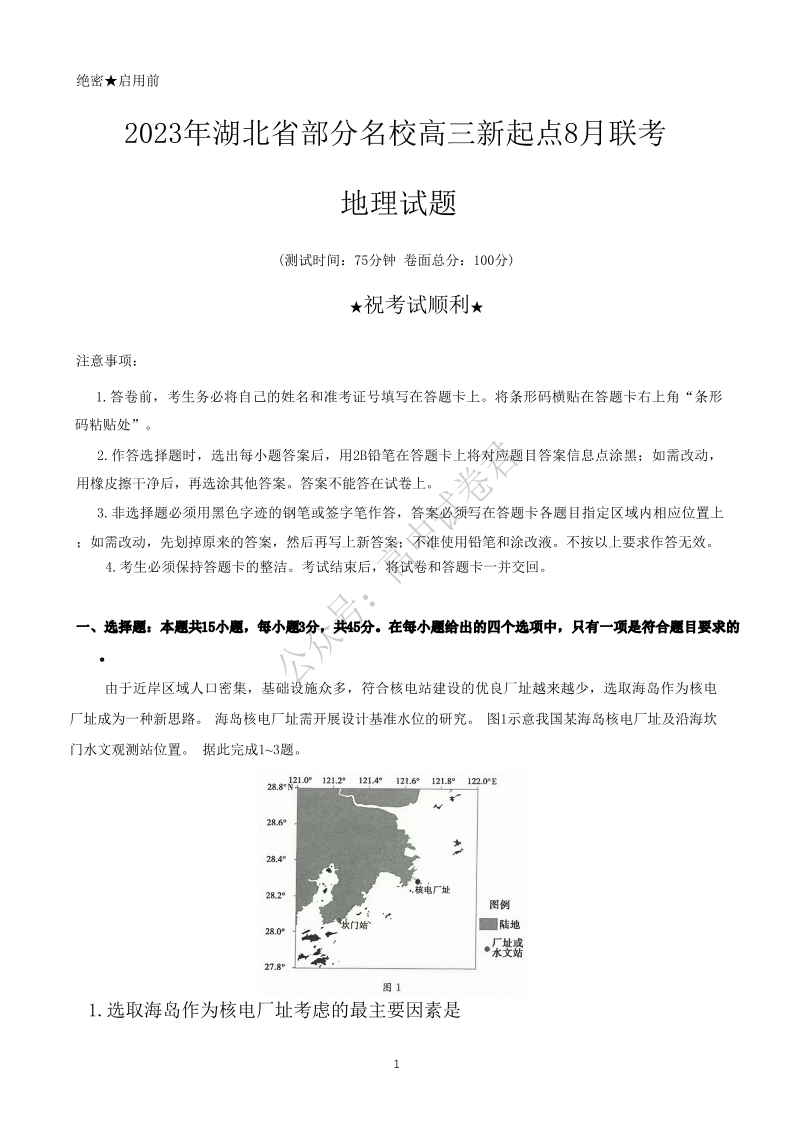 湖北省部分名校2023-2024学年高三上学期新起点8月联考 地理