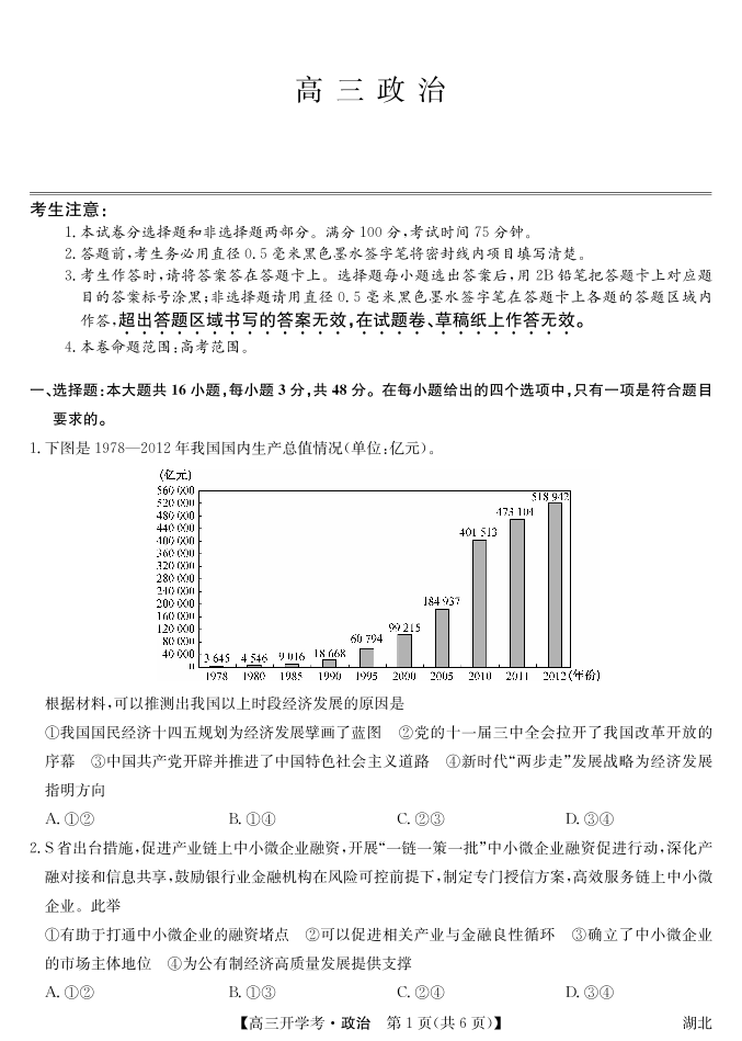 湖北省2024届高三上学期8月开学考试 政治