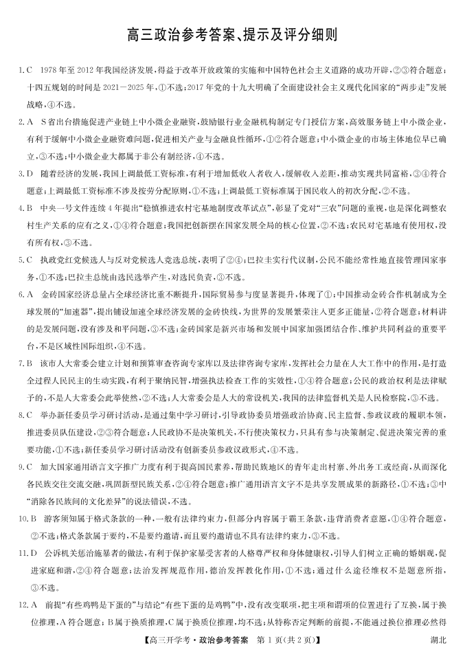 湖北省2024届高三上学期8月开学考试 政治答案