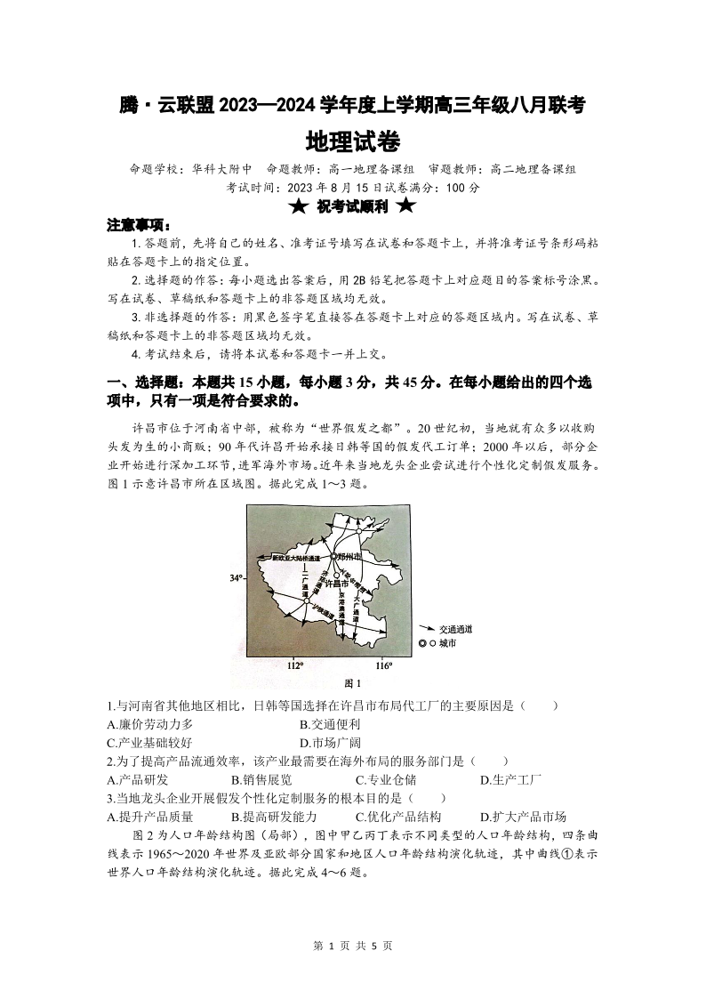 湖北省腾云联盟2023-2024学年高三上学期8月联考 地理