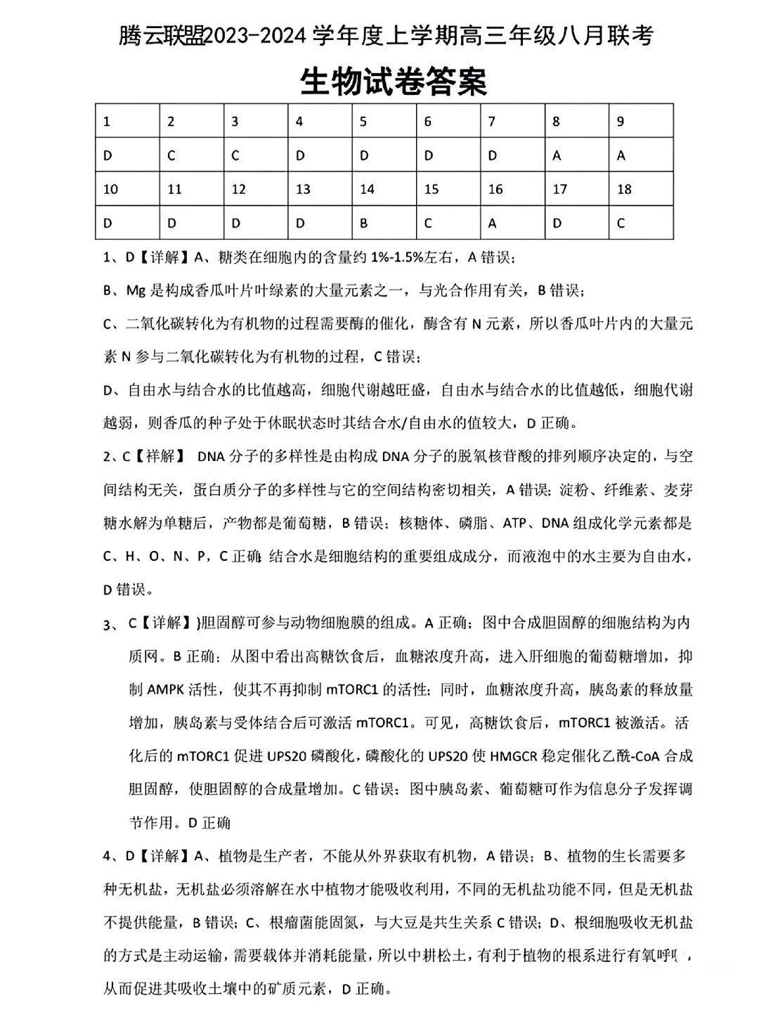 湖北省腾云联盟2023-2024学年高三上学期8月联考 生物答案