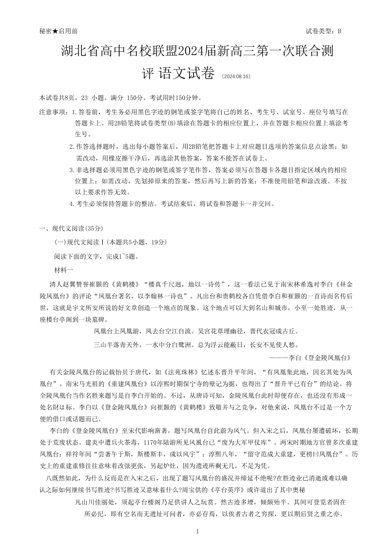 湖北省高中名校联盟2023-2024学年高三上学期第一次联合测评 语文