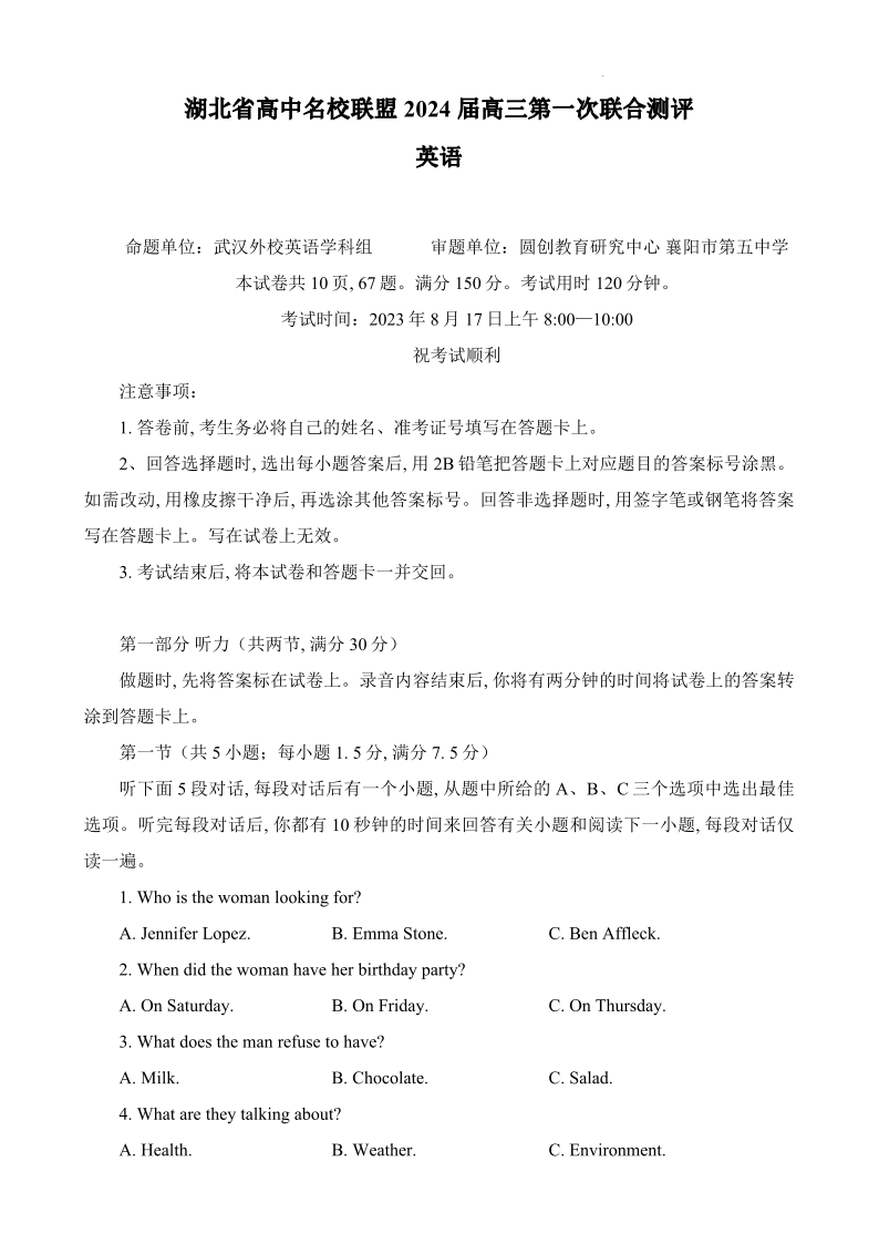 湖北省高中名校联盟2023-2024学年高三上学期第一次联合测评 英语