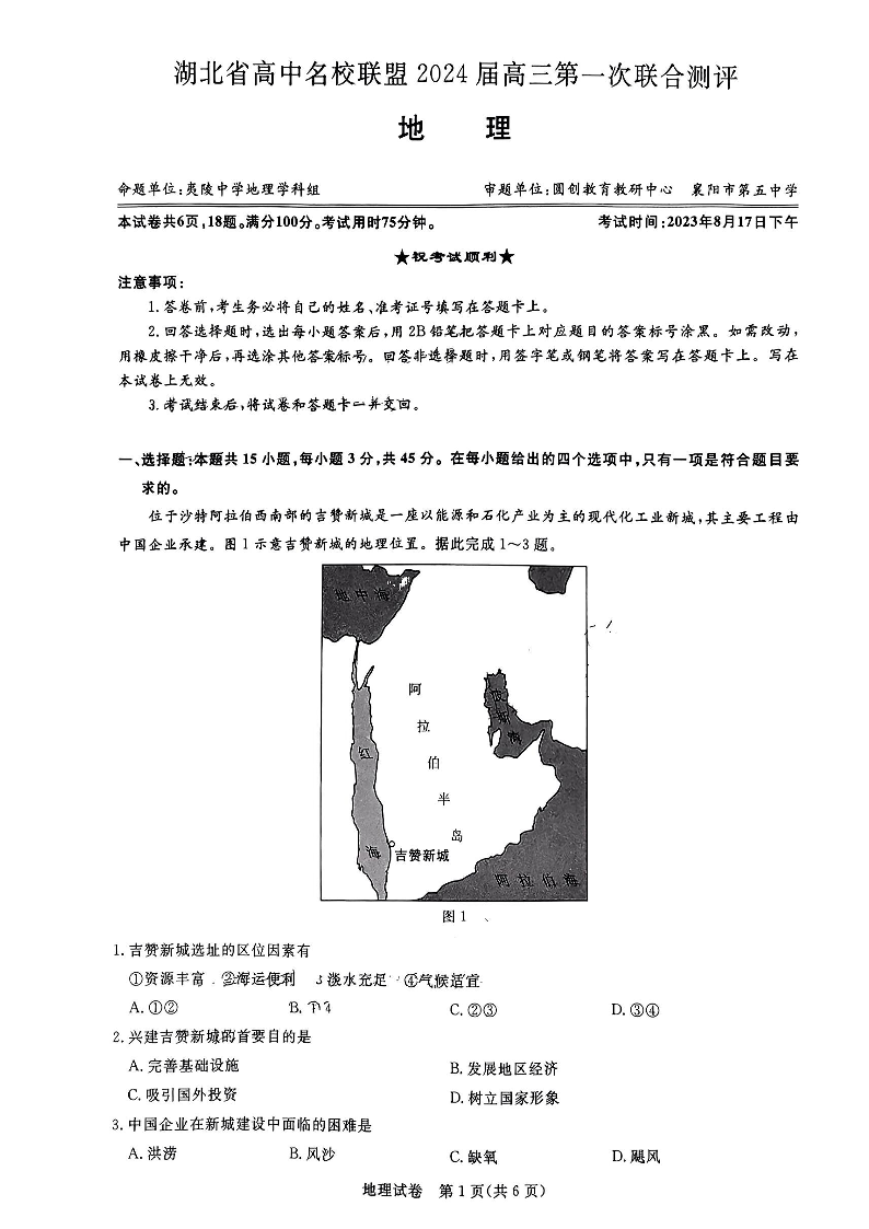 湖北省高中名校联盟2023-2024学年高三上学期第一次联合测评 地理