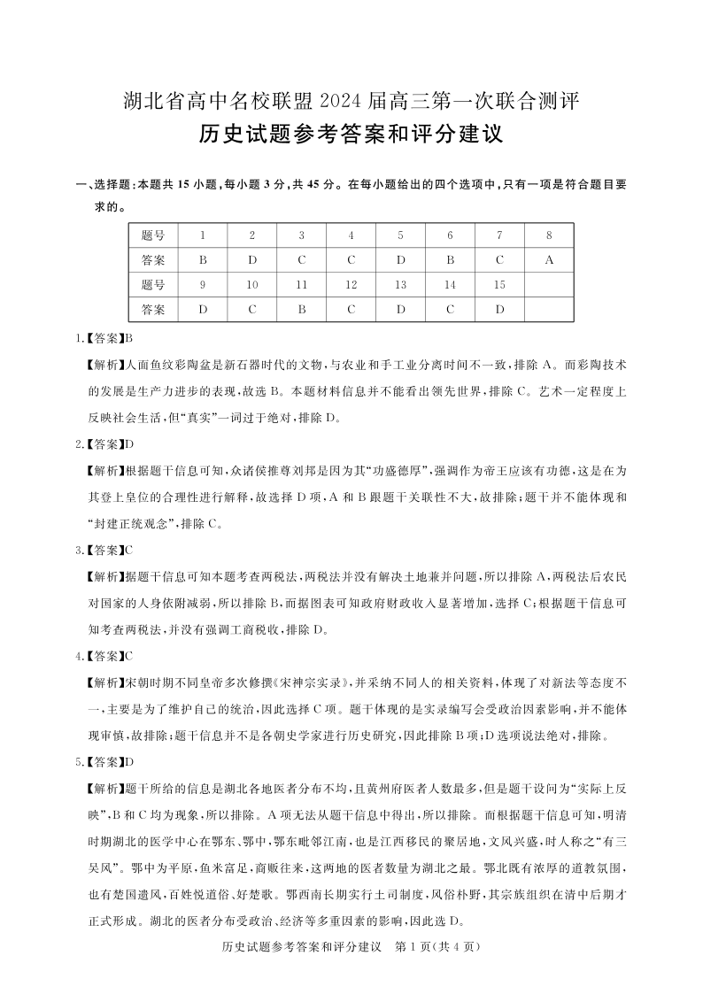 湖北省高中名校联盟2023-2024学年高三上学期第一次联合测评 历史答案