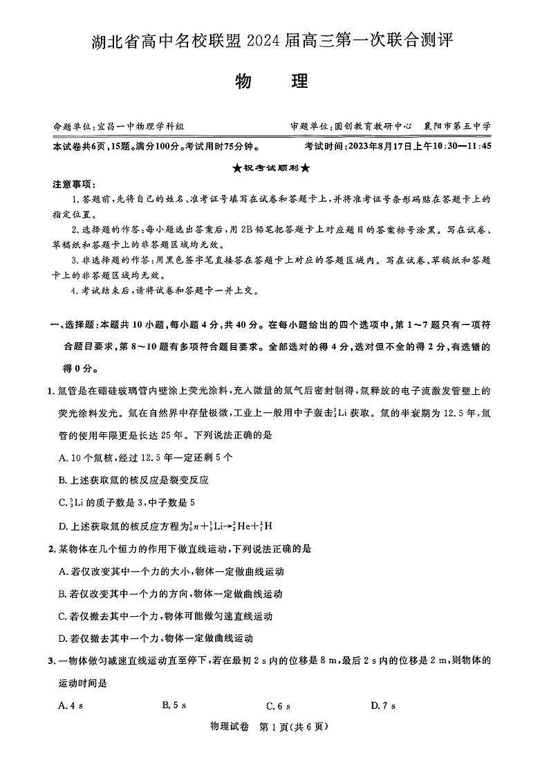 湖北省高中名校联盟2023-2024学年高三上学期第一次联合测评 物理