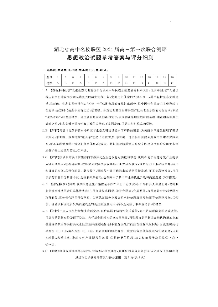 湖北省高中名校联盟2023-2024学年高三上学期第一次联合测评 政治答案