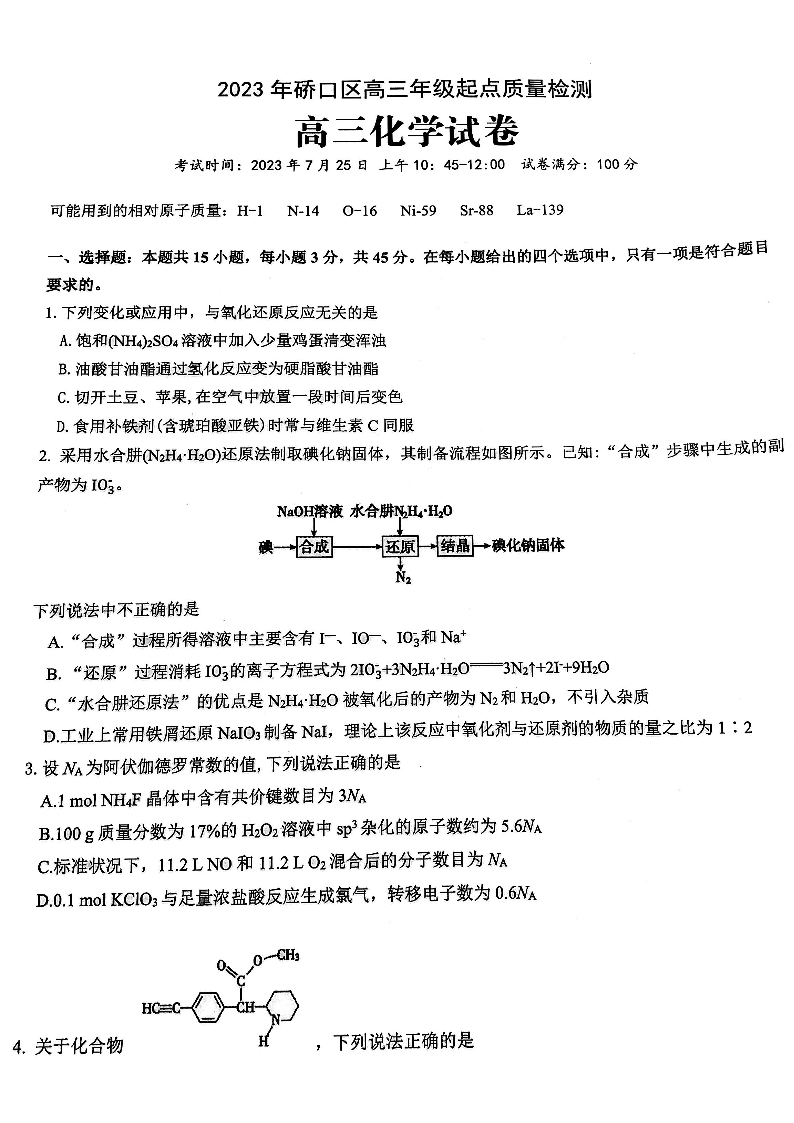 2024届武汉市硚口区高三上学期起点质量检测 化学