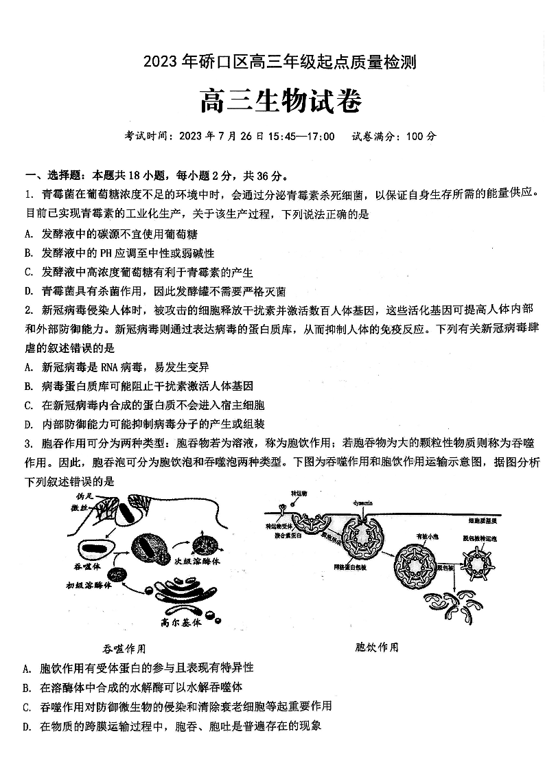 2024届武汉市硚口区高三上学期起点质量检测 生物