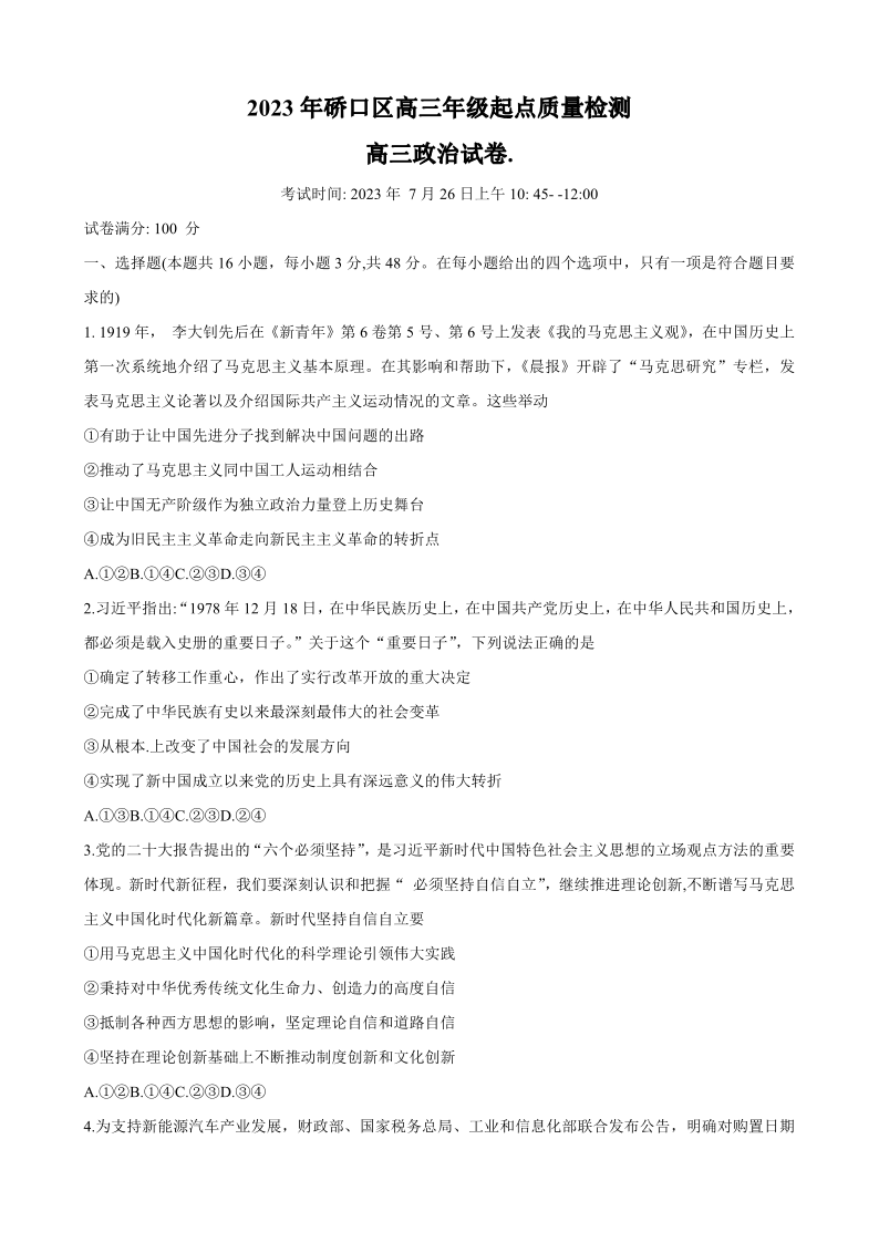 2024届武汉市硚口区高三上学期起点质量检测 政治